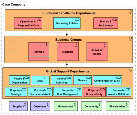 Figure 1 is an organizational model developed with Visual Paradigm software to display all organizations that could be involved in the LE transformation. Situated in the center are three business groups (BGs) in the company: nutrition, materials, and innovation center. The nutrition BG will produce nutritional products, specialty foods, and hydrocolloids; the materials BG will manufacture engineering materials, resins and functional materials, protective materials, and additive manufacturing materials; and the innovation center BG will develop biomedical, advanced solar, and bio-based products and services. These BGs have short- and long-term responsibilities in primary business functions such as innovation and R&D, direct sourcing, manufacturing and operations, and marketing and sales.