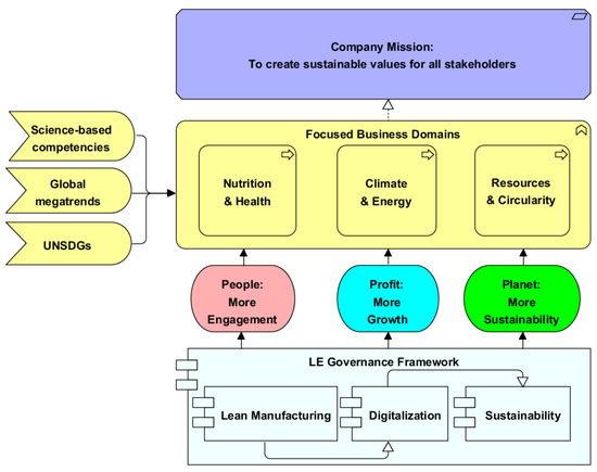 The target business architecture defines the business strategy, governance, organization, and key business processes. Figure 2 shows the target business architecture for the case company, driven by science-based core competencies, global megatrends, and the UNSDGs to achieve business goals. It depicts how the firm will be operating in the near future. The company has a mission to create sustainable value for all stakeholders, focusing on nutrition and health, climate and energy, and resources and circularity as their main business domains. Therefore, it needs to maintain a proper balance between the need to achieve profitable growth and the need to play a decisive role in the world. There must be substantial efforts to enable and accelerate this business transition. The bottom block of the figure shows that the company will continue its lean practices and maintain cost discipline to reinforce leadership in continuous improvement, optimize business support functions, and develop a global mindset as part of the company culture. It will also adopt the latest digital technologies to enhance customer experience, improve operational performance, and develop new business models to drive growth. More importantly, the company will pursue leadership in sustainability. These strategies should allow the company to achieve more engagement for people, more growth for profit, and more sustainability for the planet, thus fulfilling its commitment to fully address the TBL.