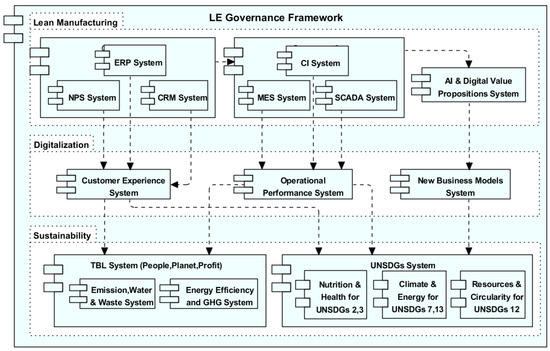 This study proposes the LEAF as a concrete solution for developing LE architecture and providing a brief roadmap for the chemical industry, which means delivering value such as effective communication and an analytical framework for firms to use to create a vision for the future business and corresponding growth strategies, and how to change or improve their organizational and other business infrastructures. Especially, the LEAF develops the LE governance framework for IT architecture and digitalization LAN. Thus, it leverages digitalization in three key areas to link lean manufacturing and sustainability: operational performance (lean manufacturing—people), customer experience (digitalization—process), and new business models (sustainability—purpose). Furthermore, the LEAF supports the chemical industry in aligning sustainability business drivers with LE WAN digital technology. This holistic framework and development process helps accelerate the transformation to reach sustainable industry goals, strengthen operational performance, and leverage digitalization to create value for customers and value-stream stakeholders. The LEAF can embed sustainability even more deeply into business goals with measurable targets. This study also contributes to developing an LE dynamics model with digitalization and sustainability for the future chemical industry. This LE model explores the three intersection areas: (1) lean manufacturing–digitalization: more engagement by employees, shareholders, and society for people (social aspect); (2) digitalization–sustainability: more sustainability by lowering costs and risks to the planet (environmental aspect): and (3) lean manufacturing–sustainability: more growth by innovative sustainable solutions for profit (economic aspect). The LE represents the three intersection areas of the TBL to balance social and environmental responsibility and economic value.