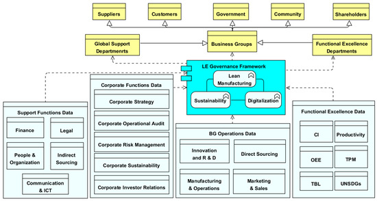 The LEAF can be implemented as a practical EA visualization tool for LE transformation. Moreover, it provides a stakeholder-centric view of the enterprise that integrates the organization’s capabilities around lean manufacturing, digitalization, and sustainability, as compared to function- or process-based approaches. However, this study’s limitation is that it has not been sufficiently tested by other firms, because our proposed LEAF and LE model come from a specific industry case, so their application to other firms would require certain customization or adaptation, because the LEAF cannot provide a transformation scope, company mission, and business goals; these have to be determined by the organization itself. Therefore, in future research, the authors intend to conduct a comprehensive analysis of the LE transformation by applying the LEAF to different chemical firms, and to use different EA methodologies like the Zachman framework to study the interactions between lean, digitalization, and sustainability for different industries. The purpose is to initiate a workable EA to reduce the complexity and risk during LE transformation.