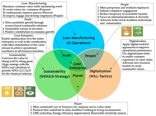 Lean manufacturing is people-oriented in terms of respecting, engaging, and developing employees, driven by a customer focus and oriented toward continuous improvement. The essential elements of lean manufacturing start from defining the purpose of values to create and the problems to solve. Then, process improvement is initiated by value stream management. Finally, people are engaged to enable the process and purpose. The idea of people as the key element of lean manufacturing includes their capability, leadership behavior, lean thinking, and culture. Digitalization in the chemical industry mainly happens in three dimensions: data management, asset optimization, and, most importantly, dramatic changes to people’s tasks in the plant. Digitalization will transform the customer experience, operational performance, and business models; these actions are all related to people. Therefore, people (social) represent the intersection of lean manufacturing and digitalization. Putting people first, the convergence of lean manufacturing and digitalization technology will achieve the purposes of making improvements for people: having easier, better, and faster processes. Thus, lean manufacturing and digitalization only work when they pair technology with the right people skills and drive change from people’s thinking and mindset and the organizational culture. Satisfied employees will provide better customer service and contribute more to society for UNSDGs 2 (zero hunger) and 3 (good health and well-being).