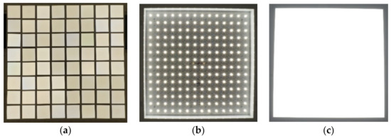To create a luminous environment with varying SPDs, two types of light panels with the same correlated color temperature (CCT) were considered: OLED light panel and LED light panel with a CCT value of 4000 K. In addition, because OLED is a surface light source and LED is a point light source, a third light panel (i.e., a covered-LED light panel) was included in the experiment to account for the differences in perception that may be caused by the difference in the direction of light emitted by the two light panels. The light fixtures were also equipped with dimming devices that allowed us to adjust illuminance levels. Five different illuminance levels were used: 287, 430, 573, 716, and 860 lux. The dimensions of the light panels were 80 × 83.5 cm for the OLED light panel and 60.5 × 60.5 cm for both the LED light panel and the covered-LED light panel. Figure 1 shows the images of the light panels used in the study.