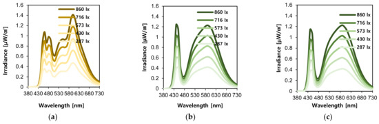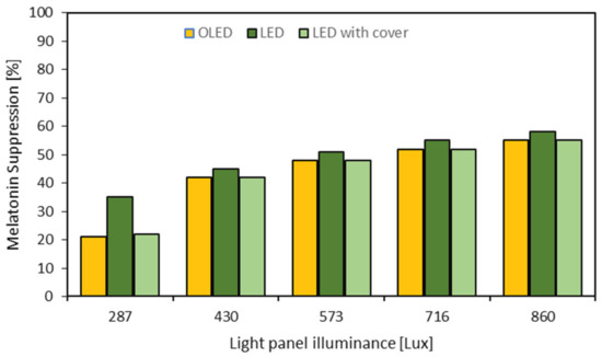 Figure 6 compares the MS by the OLED, LED and covered LED panels. As shown in the figure, the results show that the mean percentage suppression was lower under OLED lighting conditions than under both LED and covered-LED luminous conditions, further emphasizing the potential influence of SPD on MS. In addition, MS increased with an increase in illuminance levels. Moreover, the difference in melatonin-suppression levels among the lighting conditions was more pronounced at low illuminance levels (287 lux) than at high illuminance levels (480, 573, 716, and 860 lux). These differences were also statistically significant at all illuminance levels: 287 lux [F (2,6) = 34.841, p-value < 0.005], 430 lux [F (2,6) = 17.333, p-value < 0.005], 573 lux [F (2,6) = 42.000, p-value < 0.005], 716 lux [F (2,6) = 73.000, p-value < 0.005], and 860 lux [F (2,6) = 73.000, p-value < 0.005].