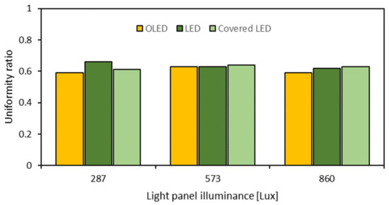 Furthermore, to ensure that the light level reaching the desks where the participants filled the questionnaire forms was the same for all the three lighting conditions, the illuminance levels on the desk under the three lighting conditions were measured. The measurements were conducted five times under three different light panel illuminances (i.e., 287 lux, 573 lux, and 860 lux) and the average was calculated. Here the difference between light panel illuminance and desk illuminance is the distance where illuminance was measured. The light panel illuminance was measured at a distance of 30 mm below the light panel to ensure that the illuminance levels initially emitted by the three light panels were identical, whereas the desk illuminance was measured at 1.7 m below the light panel, directly in the center of the desk. The desk illuminance was relatively similar under the three lighting conditions. For example, the desk illuminance when the light panel illuminance was 287 lux for OLED lighting conditions, LED lighting conditions and covered LED lighting conditions were 255 lux, 267 lux, and 269 lux respectively, indicating no substantial differences in the desk illuminances among the three lighting conditions. Similarly, no substantial differences were observed at higher light panel illuminances (i.e., 573 lux and 860 lux). Furthermore, illuminance distribution was fairly the same under the three light conditions as measured by the uniformity ratio (See Figure 4). The uniformity ratio was determined as the quotient of the maximum and minimum illuminance levels among the 25 points uniformly distributed across the workspace.