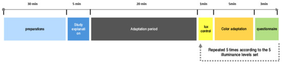 On the day of the experiment, the first 30 min were used to set up the experiment room and other general preparations, such as setting up chairs for the participants. The following 5 min were used to explain the study to the participants. The participants were then allowed 20 min to adapt to the experimental lighting conditions. Thereafter, two participants at a time were asked to evaluate the luminous conditions using the survey questionnaires discussed in Section 2.4. This was repeated five times to cover the five illuminance conditions discussed in Section 2.1. Furthermore, for the entire experiment, the participants were chosen randomly and sent into the room to begin their evaluations. They were not aware of the type of light panel they were evaluating. In addition, there was no specific order upon which the light panels were evaluated. Figure 5 illustrates the experiment protocol.