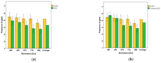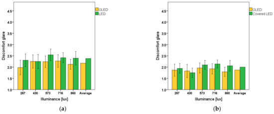 Subjective evaluation of presence of discomfort glare: (a) OLED vs. LED and (b) OLED vs. covered LED.
