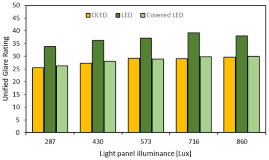 Considering the objective assessment of discomfort glare (i.e., using the UGR index), the OLED light panel had the lowest UGR value, followed by the covered LED and then the LED lighting. Taking a UGR value of 28 as the maximum acceptable value for indoor discomfort glare, the OLED light panel at 287 lux (UGR = 25.5) and 430 lux (UGR = 27.3) and the covered-LED light panel at 287 lux (UGR = 26.7) provided a glare-free environment. Figure 10 compares the UGR values among the three light panels, from which it is evident that the glare under LED lighting conditions increased with an increase in illuminance levels, whereas, under OLED lighting conditions, glare-level changes were relatively minor with changing illuminance levels.