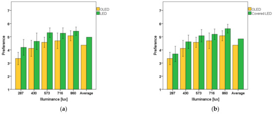 Figure 11 shows the difference in preference under different luminous environments. On average, participants preferred LED lighting conditions over OLED lighting conditions. Subsequent t-test analyses also indicated statistically significant differences in preference levels under OLED and LED lighting conditions at 287 and 430 lux, respectively. There were also differences in preference levels under the OLED and covered-LED lighting conditions, but these were not statistically significant.