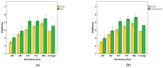 Subjective evaluation of perceived brightness: (a) OLED vs. LED and (b) OLED vs. covered LED.