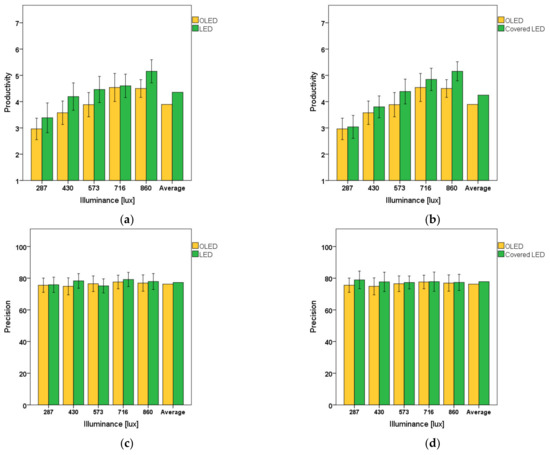 Self-reported productivity: (a) OLED vs. LED and (b) OLED vs. covered LED. Precision: (c) OLED vs. LED and (d) OLED vs. covered LED.