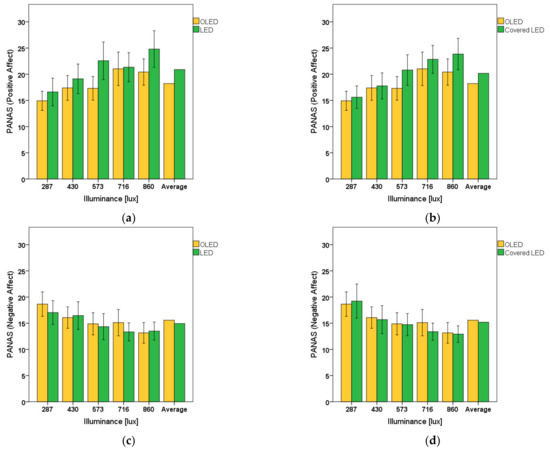 Subjective evaluation of mood. Positive mood: (a) OLED vs. LED and (b) OLED vs. covered LED. Negative mood: (c) OLED vs. LED and (d) OLED vs. covered LED.