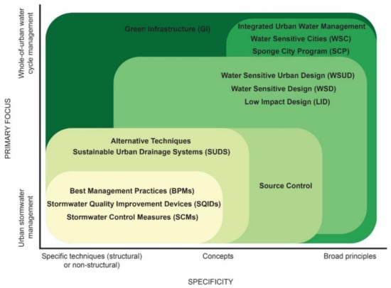 Water Sensitive Urban Design (WSUD), Low Impact Development (LID), Water Sensitive Cities (WSC), Sponge City Program (SCP), Green Infrastructure (GI), Sustainable Urban Drainage Systems (SUDS) are terms and programs that originated in different countries and present sets of strategies to manage urban water systems. They share common aspects, have similar characteristics, and became ubiquitous in recent decades. These strategies include urban design approaches and solutions, plus recommendations for regulations, policies, and implementation. WSUD originated in Australia and developed broader objectives concerning water management, consisting of higher applicability from the architecture point of view. Figure 1 below highlights an example of urban drainage terminology classification [], which puts together the terms and programs in relation to specific techniques, concepts, and broad principles.