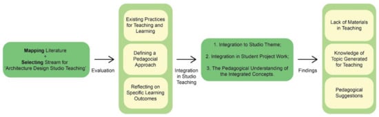The methodological framework of the study is divided into four parts. First, the study benefits from a literature review, which involves mapping the existing literature related to the water-sensitive design and teaching nexus. In doing so, a specific stream for architecture design studio teaching is selected, mainly highlighting the comprehensiveness of the selected topic and its relevance to architectural design education. In the second step, the study goes through a set of evaluations including the assessment of (1) existing practices for teaching and learning in relevant areas, (2) defining a pedagogical approach, and (3) reflecting on specific learning outcomes embedded in the program. Then, the concepts are integrated into the studio teaching, first through the studio theme, then the student project work in the design studio unit, and the pedagogical understanding of the integrated concepts in teaching. Here, the pedagogical aspects include the study area of the project, including its size and location, specific project requirements, and the theme of the study. As part of this study, 32 students (in one design studio unit) were involved in two cohorts of a third year and final year undergraduate program in architecture. The duration of the project was eight months, including two academic semesters. The team involved in this pedagogical study included two full-time teaching staff and one part-time staff, including two senior and one junior members, with at least three years of teaching experience. Following the integration and pedagogical work, the study suggests three sets of findings in the last stage of the methodological framework. These include a detailed understanding of the lack of materials in teaching, recognizing and valuing the knowledge of topics generated for teaching from the perspective of WSD-Sustainability research in the architecture design studio teaching, and pedagogical suggestions relevant to the future work. The steps are summarized in Figure 2 below.
