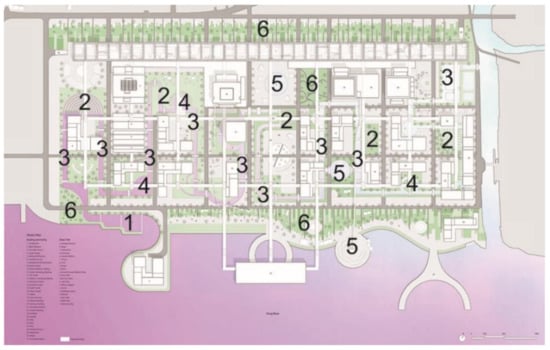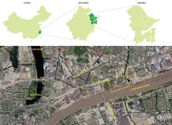 The site area is 0.28 km2 (approximately 700 m × 400 m) and is located in the district of Jiangbei, northeast of Ningbo, east of Rihu Park, and on the margin of the river Yong (Figure 3). The site is composed by a large industrial complex reminiscent of fishing companies. The site context encourages students to deal with historical, social, economic, and environmental aspects. Considering the natural topography, the site offers two challenges: the harbor waterfront and the risk of flooding caused by typhoons. Moreover, the site is identified and acquired by the municipality as part of a major transformation plan for the north riverbank of Yong River. Although the aim is to build a creative industrial zone, the municipal government has approved a masterplan that is predominantly commercial-oriented. The project brief and proposed designs thus explore the alternatives for recognizing the rich industrial heritage while exploring WSD as an alternative sustainable solution.
