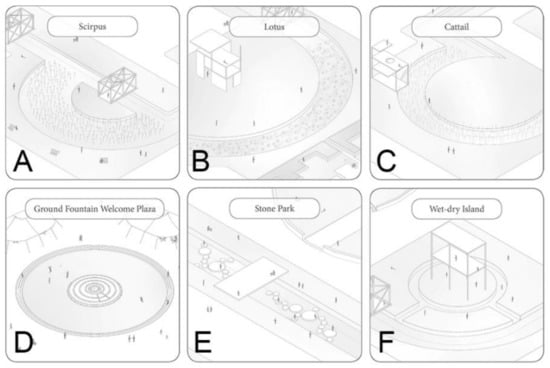 Six urban spaces connected to the water canal. Top row (A–C): diverse plant filtration; Bottom row (D–F): integration of public spaces to water features, designed by: Tianning Ren, Yulin Zhang, Yixuan Chen, Jiamei Song, 2020.