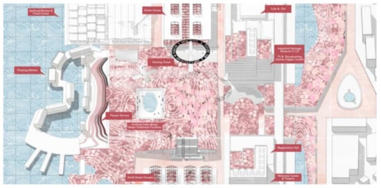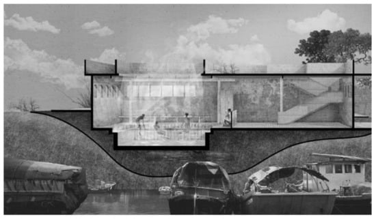 More recently, Von Richthofen proposed the development of an architectural studio, to be called ‘With/Out Water’ [] to consider the water–food nexus in Khulna, Bangladesh (this document consists of a syllabus plus documentation of students’ projects), to discuss the connections between water, food production/consumption, and urbanization. The chosen site is composed by a system of ponds and canals with communities at risk, different from that of the previous papers, it is not a post-industrial site. The studio has a strong focus on the water topic and parametric design, but the notion of WSD is not mentioned. The quality of this studio is assured by a series of input lectures on diverse topics such as urban-rural ecosystems, humanitarian architecture, and ecosystems services, among others.