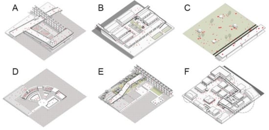 Students worked on tasks common to architectural and urban design: precedents studies; literature review; mapping; interview; photography; videos; architectural drawings; models; sketchbook. These tasks are documented and criticized every week by three tutors in groups or individually. Students’ aim is to prepare a complete design documentation to be delivered at the end of the semester as the portfolio. Furthermore, this studio encouraged the students to identify their own interests and relevant theories to support their design concept and development, and to consider WSD as a guideline for any site intervention. This corresponds to the problem-based learning (PBL) concept in which students work on sustainable solutions for complex and real problems. PBL requires high levels of collaboration, integration of different disciplines, and development of citizenship mind. PBL formulates non-structured problems aiming at students’ specific knowledge development and problem-solving skills [].