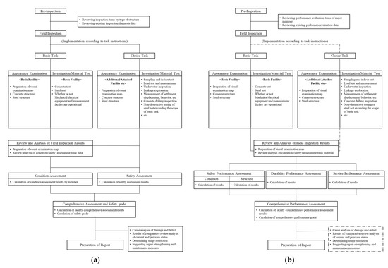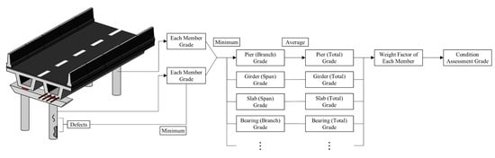 In Korea, the safety diagnosis of bridges is performed by the management authority of each bridge according to special laws on facility safety management and using the “Detailed Guideline for Safety Inspection and Precision Safety Diagnosis” published by the Korea Infrastructure Safety and Technology Corporation (KISTEC) [23]. The types of safety diagnoses conducted at certain intervals, depending on the condition of a bridge, are divided into “regular”, “precision”, “emergency”, and “precision safety”. In addition, inspection types are divided into “appearance examination,” to evaluate the appearance condition of the bridge; “investigation/material test” to evaluate the material condition of the bridge via the use of additional test equipment; and “structural safety” to evaluate its structural safety via the performance of loading test and numerical analysis. The diagnosis flow of “precision safety diagnosis”, including all inspection tasks, is shown in Figure 1a, with the ranges of basic and choice tasks for each inspection type varying depending on the type of safety diagnosis. In addition, [24] recently established the “Detailed Guideline for Safety and Maintenance Implementation of Facilities (Performance Evaluation)” by introducing the concept of performance in safety diagnosis as the requirement to inspect both structural safety and serviceability. As shown in Figure 1b, the diagnosis flow of performance evaluation defines “safety performance assessment” by integrating “structural safety” with “appearance examination” and revises “investigation/material test” as an independent inspection type for durability assessment. In addition, “service performance” is a type of inspection included to inspect the serviceability of a bridge. Diagnosis and inspection are performed according to [23,24] at certain intervals and the condition rating of the bridge condition is calculated to manage it efficiently. The bridge condition rating calculated by the process shown in Figure 2 is represented as the defect index. The defect of a member is graded from A to E, and the defect for each grade is scored to calculate the grade and defect index of the overall bridge.