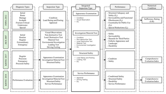 The above review and comparison of the diagnosis systems for three countries demonstrates the differences in the diagnosis types, definitions of bridge performance, and evaluation processes of diagnosis results. However, the inspection types that inspect the appearance condition, material condition, structural safety, and service performance are similar. The appearance condition is primarily investigated by visual observation and simple equipment, and the material condition is investigated using additional equipment for non-destructive and local-destructive tests. In addition, structural safety is investigated using hand calculations, numerical analysis, and loading tests; service performance assessment, such as driving feeling, traffic volume, and inspection facility, is one of the main types of inspections to investigate the usefulness of a facility to users. Therefore, establishing an information system that can be used internationally requires information on diagnosis systems to be organized according to the inspection type.