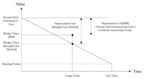 The depreciation cost, which is an important piece of information required to estimate the deterioration of a bridge’s value, is considered a cost. To accurately calculate the decrease in value of a long-lived bridge, the straight-line method, which calculates the depreciation cost based on the assumption that value decreases steadily throughout the available life, is mostly used for valuation. The depreciation cost using the straight-line method is calculated using Equation (19). For the available life required to calculate the depreciation cost, the bridge remaining life, which is generally determined and calculated through investigation/material tests, can be used. The straight-line method has an advantage in that the depreciation cost for numerous bridges can be calculated in a simple manner; however, a realistic decrease in value cannot be reflected because depreciation due to the aging of a bridge is not consistent with respect to time. The limitations of the straight-line method can be overcome by the written-down replacement cost (WDRC) method, introduced in Table 2, by utilizing the bridge health index (BHI). The BHI is derived via a safety diagnosis to calculate depreciation cost. The BHI is a numerical value representing the condition of a bridge with respect to its aging. The BHI can also be expressed as the defect index (DI). The depreciation cost is calculated using the BHI as in Equation (20) and requires historical information of safety diagnosis, but a more realistic depreciation cost can be calculated compared with that calculated using the straight-line method.