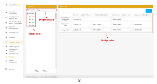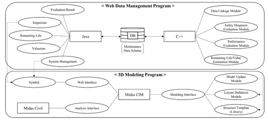 C++ was utilized in the WDMP to include functions for data linking and automatic calculation. Information accumulated in the DB thorough Java are automatically linked and reflected in the C++ module. A Data Linkage Module can minimize repetitive tasks of information input and prevent information loss. A Safety Diagnosis Evaluation Module and Performance Evaluation Module are established separately because, in Korea, evaluation methods for bridges are divided into safety diagnosis and performance evaluation, and the evaluation processes are different, as previously mentioned. In addition, the remaining life and value of a bridge are automatically calculated by the Remaining Life/Value Evaluation Module.