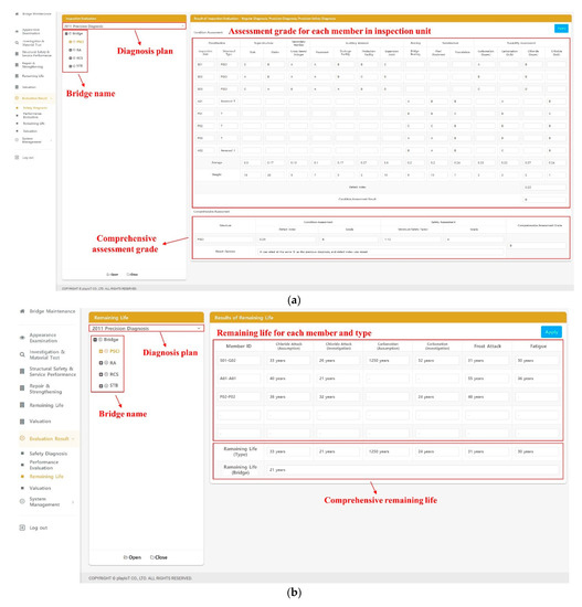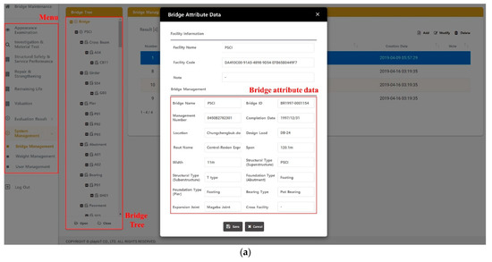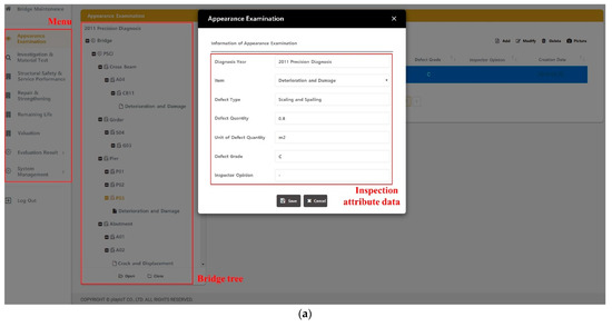 Detailed information for each inspection item should be included in the BMS to utilize the information on safety diagnosis as a valuable factor for maintenance decision making. In this study, detailed information was derived as listed in Table 3, via the investigation of reports on safety diagnosis performed previously, such that information on both existing, currently operational bridges and new bridges can be managed. Because reports, including those on loading tests and calculation processes for safety rates, are submitted separately, and including all this information as data to be used in BMS is difficult, only safety grade and inspector opinion were applied to the BMS information system as detailed information on structural safety. In addition, because service performance is not a quantitative but a qualitative evaluation, only the detailed information as used for structural safety was applied to the information system.