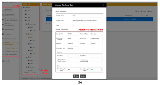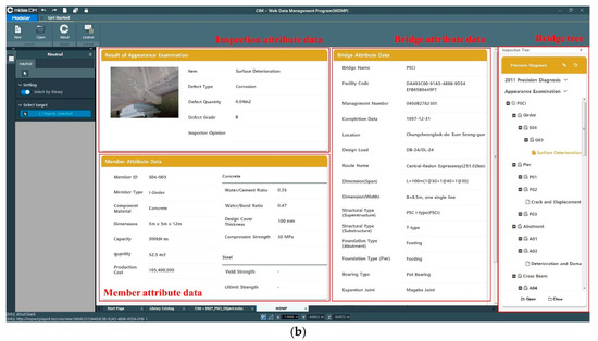 For BIM-based efficient management and sharing of information generated from bridge maintenance, information should be managed on the web and visually identified with a 3D bridge model. Midas CIM is a 3D bridge modeling program, but an application program interface (API), which can allow the information structure to be extended by users, is not provided in Midas CIM. Therefore, in this study, a web data management program (WDMP) based on the maintenance data schema established above was separately developed and connected to a Midas CIM to construct the BMS illustrated in Figure 6. For program connection and representation of the information location on the bridge, symbols for bridge ID, inspection unit ID, member ID, and location coordinates were used. By selecting the symbol, users can link the history entity in the WDMP to a symbol in Midas CIM, and check the previously linked related attribute data of the bridge, members, and inspections. The prototype of the BMS developed in this study was applied to an actual bridge in Korea, and the performance, calculation process, and diagnosis flow relating to Korea was applied in the WDMP.