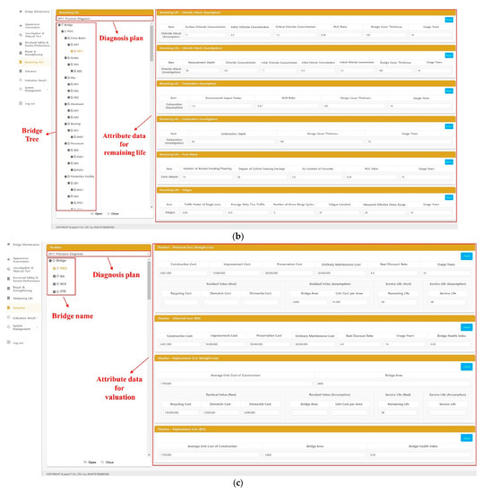 The screen that represents the main functions of the WDMP is shown in Figure 7, Figure 8 and Figure 9. In the bridge management menu (Figure 7) of system management, users can manage the bridge tree that represents the configuration of bridge components. The bridge tree includes bridge name, diagnosis plan, inspection unit ID, and member ID. Once a user creates a bridge or a member, their attribute data can be managed. The other main function of the WDMP is input of historical attribute data for diagnosis, remaining life, and valuation (Figure 8). A user can input historical information to each bridge and member created in the bridge management menu. Some data mentioned in Table 4 and Table 5 are automatically linked with data entered previously. The level of historical information is divided into bridge and member levels. The information level is defined according to inspection type in Figure 5. The final main function is auto-calculation of results including diagnosis, the remaining life, and the bridge value (Figure 9). Results of remaining life and valuation can be used as scientific evidence for decision making about maintenance. Using entered historical information, results are auto-calculated by C++. In the WDMP, because all information that can be managed is stored in a data format, data usability is improved via data linking and auto-calculation. However, sensor data and the decision-making process is not included in the WDMP. Addressing these points will improve the usefulness of the WDMP.