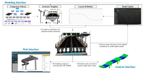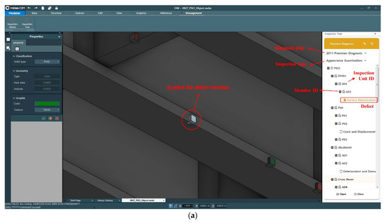 During the safety diagnosis of a certain bridge, structural analysis is performed to assess the structural safety. For this process, a significant amount of time is required to construct a model for finite element analysis. Functions for extracting a 3D object based on a center line that can be converted to a structural analysis model in 1D or 2D, and for automatically generating a finite element mesh, are established in CIM. The converted structural model is linked to Midas Civil, finite element analysis program, which can reduce the time required to construct a model during safety diagnosis. In addition, a web interface was developed in the CIM to link the 3D information model with the WDMP. The configuration system of the bridge, its attribute data, and diagnosis history can be checked through this web interface. The locations of each diagnosis history are expressed in the 3D model using a hexagonal symbol. The inspection type is distinguished by symbol color, and the symbols are linked to the WDMP via an ID consisting of location coordinate, bridge ID, inspection unit ID, and member ID (Figure 11).