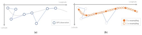 where x and y are the GPS longitude and latitude estimates, respectively. and is the sampling rate assumed in the system model. can be set separately from the GPS sampling rate. Equally spaced resampled estimates can be obtained even at irregular data intervals or in the case of missing data (Figure 1), by specifying shorter intervals. In the case of the acquired data, although the data were acquired at a sampling interval of 5 s, the interval could be 4 s or 30 s due to missing data or other reasons, depending on the data. Conversely, the smoothing process can be used to obtain data at the desired intervals, such as at 5 or 10 s.