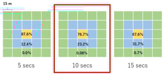 The size of the discretized grid was set to approximately 15 m considering the size of the buildings in the park and the accuracy of the data. Resampling to an appropriate sampling rate for this grid size facilitates the application of the models for sequential decision processes such as the Markovian Decision Processes (MDPs). When the sampling rate is changed to 5, 10, or 15 s, the probability of staying in the same grid, transitioning to the adjacent eight grids, and transitioning to the 16 grids, two grids ahead are calculated, respectively. Ideally, the transition probability to the neighboring grid must be maximized while minimizing the transition probability to jump two places ahead. This ensures consistency with the grid-based representation for path choice [13,22]. In particular, a sampling rate of 10 s resulted in a transition probability of approximately 23% to the neighboring grids, whereas the transition to the grid two steps ahead was suppressed to approximately 0.08 % (Figure 5). The results of resampling at this 10-second-sampling-rate were used in the following analysis.