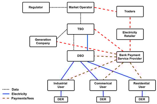 Figure 2 illustrates a “centralised” electricity market arrangement, which is typical in most developed Western countries, where liberalised electricity markets have been implemented for several decades. This is a “top-down” market design, with users in the residential, commercial, and industrial sectors assumed to be price-takers, purchasing electricity from energy supply companies or retailers (Figure 2). The retailers then interact with various other entities in order to trade electricity in a centralised pool market.