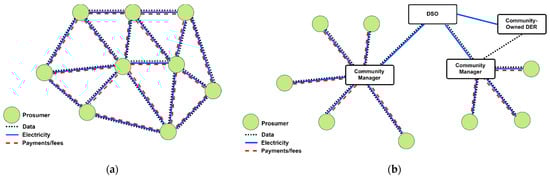 Decentralised market architectures can be in the form of a “full P2P” design (each peer in the network is capable of directly trading with any other peer, Figure 3a). Alternatively, they may have a more structured “community-based” design (each local area has a community manager that manages transactions within the local community and interactions with the rest of the electricity system, Figure 3b). The “prosumer” indicated in Figure 3 refers to an active energy citizen who may be both a consumer and producer of electrical energy, subject to the availability of local renewable energy resources and energy flexibility [].