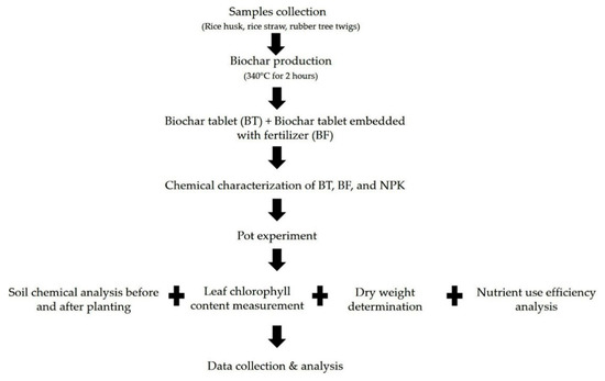 The rice straw, rice husk, and rubber tree twigs used in this present study were procured from a paddy field (6.445558° N, 100.318728° E) and a rubber tree plantation (6.521817° N, 100.309526° E) in Perlis, northern Malaysia. The samples were sun-dried for 3 days after which the rubber tree twigs were cut into 2 cm using a wood chipper (RC61605, SIMA, Shandong, China) whereas the rice straw was cut into 15 cm size. The rubber tree twigs, rice straw, and rice husks were charred separately before the production of the biochar tablets with and without embedded fertilizer. Figure 1 shows a diagram of the study workflow.