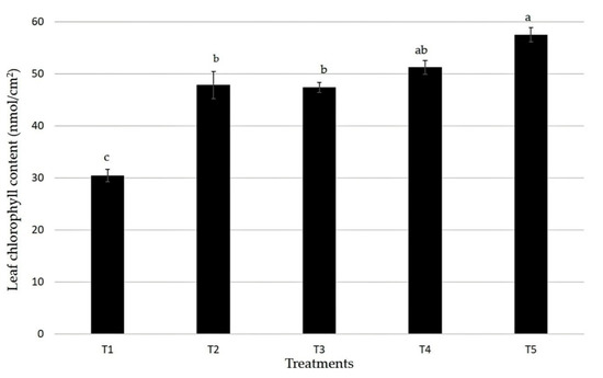 Our study revealed that the plants which were treated with T5 demonstrated the highest leaf chlorophyll content. The leaf chlorophyll content of T1 was the highest followed by T4 (Figure 3). T1 showed the lowest leaf chlorophyll content while T2 and T3 showed no significant difference.