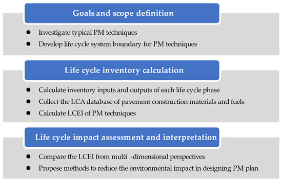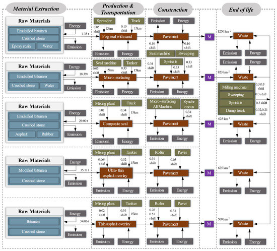 Until now, the focus points of existing pavement LCA studies are mainly restorative maintenance techniques and their environmental assessments, with the evaluation categories mostly limited to energy consumption or carbon dioxide emissions [25,32,33,34,35]. In addition, as for pavement PM techniques, Ma, et al. [36] estimated greenhouse gas emissions of 16 pavement maintenance techniques with the system boundary limited to cradle-to-gate, and indicated that increasing the frequency of PM techniques could achieve low-emissions maintenance planning. In addition, similar work was carried out by Qi [37] and Han, et al. [38]. Furthermore, Wang, et al. [39] pointed out that PM techniques are essential to reduce energy consumption by analyzing the energy consumption of pavement projects in Inner Mongolia, China. Overall, it is well known that PM plays an important role in mitigating environmental emissions throughout the whole life cycle of asphalt pavement. Although LCA of pavement PM techniques has been carried out by some researchers, previous studies have failed to assess the comprehensive environmental impacts of commonly used PM techniques, leading to a lack of LCEI inventories of PM techniques, which are a critical database for sustainable maintenance planning in the pavement life cycle [40,41].
