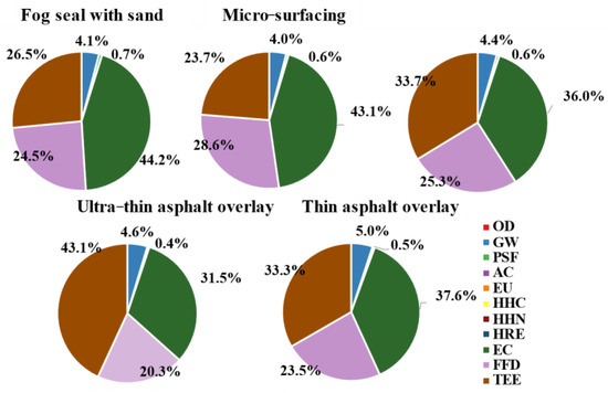 Based on the LCI calculation method described in Section 2.3, the potential LCEI were calculated. Figure 4 shows the composition ratio of each PM technique to the LCEI categories. It can be found that the LCEI categories generated by PM techniques were mainly TEE, FFD, EC, GW, and PSF, with proportions of 23.7–43.1%, 20.3–28.6%, 31.5–44.2%, 4.0–5.0%, and 0.4–0.7%, respectively. However, FFD and EC were often neglected by previous research [25,26]. It is noteworthy that the composition ratios of the ultra-thin asphalt overlay and thin asphalt overlay were almost similar to those of LCEI, which stems from their similar construction technology processes and raw materials. However, the differences in the proportion of various indicators between the three seal coat techniques were significant.