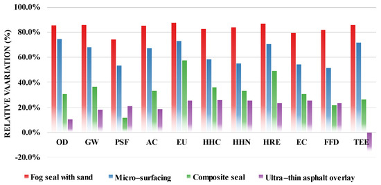 Figure 6 also shows that the LCEI of thin asphalt overlayer and ultra-thin asphalt overlay were extremely closed. Combined with Figure 5, it can be seen that the LCEI of the five PM techniques is as follows: fog seal with sand < micro-surfacing < composite seal < ultra-thin asphalt overlay < thin asphalt overlay. The main reasons can be concluded as follows: