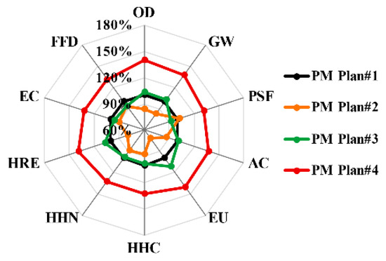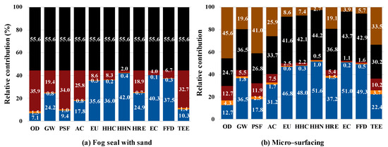 Figure 6 shows the relative contribution of the six phases to LCEI. It can be seen that the LCEI characteristics of different PM techniques are mainly generated by the raw material phase and maintenance phase, although the exact order varies depending on the impact category. Regardless of the PM techniques, the raw materials phase has a significance impact on EU, HHC, HHN, HRE, EC and FFD, with relative contributions of 35.6–59.3%, 36.0–59.2%, 42.0–62.2%, 24.9–50.6%, 40.3–59.8%, and 37.5–52.9%, respectively. While in the production phase, OD, GW, and AC were the main contributors with relative contributions of 26.2–44.1%, 16.3–25.8%, and 15.5–24.6%, respectively. In particular, TEE still accounts for a large proportion in this phase due to the mixture production. The construction phase and end-of-life phase mainly affect PSF and OD. Due to the differing performance (equivalent to service life), the maintenance phase of fog seal with sand has the largest contribution (55.6%), and the raw material phase was still the main contributor in terms of the other four main impact categories.