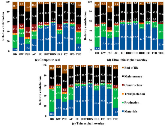 Figure 5 shows the relative LCEI of each PM technique, the principle of interpretation of the results was based on the impact scores of thin asphalt overlay, with a positive number indicating a benefit to environmental protection and the opposite being harmful to the environment. The results show that the fog seal with sand and the micro-surfacing have a great effect on the environment protection, with an improvement of more than 50% in all impact scores, followed by composite seal, and ultra-thin asphalt overlay. Indeed, the seal coat techniques can be considered as an eco-friendly alternative technique for PM because these three PM techniques can reduce the potential score in all impact categories. Among the ten LCEI categories, the most improvements are EU (57.5–87.6%), HRE (48.8–86.5%), GW (36.4–85.7%), OD (30.5–85.6%), AC (33.2–84.8%), and TEE (26.3–86.0%) also can be saved. Moreover, ultra-thin asphalt overlay exhibits a negative impact on energy saving (15.1% increase in TEE) due to the use of modified asphalt. However, although these five impact categories accounted for a large proportion of the total, there were also significant differences between each PM technique, such as the most significant reduction of FDD by fog seal with sand, which was about 30.2% and 60.1% higher than that of micro-surfacing and composite seal, respectively. This was due to the variability in the construction process and raw material composition of the different PM techniques. Thus, it is necessary to analyze the effects of different life cycle phases and inventory inputs in detail.