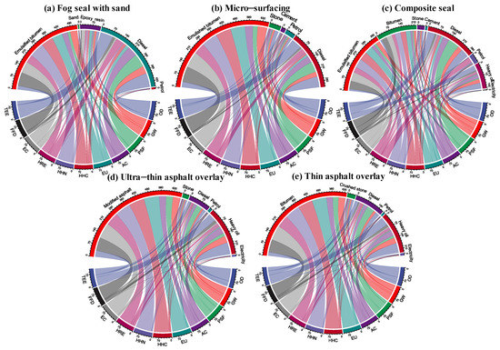 The enrichment string chart was originally used in bioinformatics engineering to characterize which proteins are involved in “Go term” synthesis. In this study, it was used to characterize the percentage contribution of different inventory inputs to ten LCEI categories; that is, all LCEI categories (lower semicircle part) are presented at 100% of the length. The inventory inputs (upper semicircle part) emit lines of different intensities for each LCEI category, where a line of greater intensity indicates a greater contribution to that LCEI category and vice versa, when no line is emitted, no contribution is generated. Regardless of the PM techniques, bitumen materials inputs took up the vast majority of the proportion. Nevertheless, the remaining inputs also play an important role in the LCEI. In terms of fog seal with sand, diesel has the second highest consumption with 205.6 kg, contributing 82.4%, 78.1%, and 75.2%to OD, PSF, and TEE, respectively. It is noteworthy that epoxy resin, with a mass of only 1.5% of raw materials, became the third largest contributor to LCEI, especially EC (22.2%), since the production of polymers releases toxic gases such as aromatic hydrocarbons. Similar to fog seal with sand, diesel was also the second largest contributor to micro-surfacing with consumption of 325.4 kg. Unlike that, the other three techniques (composite seal, ultra-thin asphalt overlay, thin asphalt overlay) consume heavy oil and electricity in addition to diesel, it can be found to consume 448.1 kg, 315.7 kg, and 437.0 kg of diesel and 448.1 kg, 1075.4 kg, and 982.9 kg of heavy oil, respectively, indicating that the fundamental difference in environmental impacts between composite seal and the ultra-thin asphalt overlay lies in the production phase. Although the former requires more machinery and consumes more diesel in construction phase, the latter consumes much more heavy oil in the production phase than that. Therefore, the environmental performance of composite seal is better than ultra-thin asphalt overlay in terms of middle-PM.