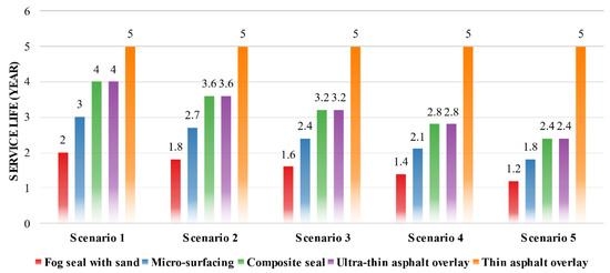 - The thin asphalt overlay was used as the baseline; that is, its lifetime was maintained at 5 years, while the remaining four PM techniques decayed at 0% (Scenario 1), 10%, 20%, 30%, and 40% of the pre-defined lifetime (Section 2.3.5), as shown in Figure 8. For example, the service life in Scenario 2 was decreased by 10%, so the service life of fog seal with sand, micro-surfacing, composite seal, and ultra-thin asphalt overlay were descending from the 4, 4, 3, and 2 years to 3.6, 3.6, 2.7, and 1.8 years, respectively.