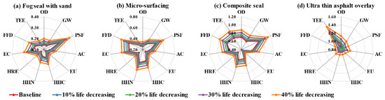 Based on the results in Section 3.1, the LCEI under different scenarios can be calculated, and the relative values were used to compare the LCEI under five scenarios from fog seal with sand, micro-surfacing, composite seal, to ultra-thin asphalt. Figure 9 shows the relative environmental performance and trends of the four techniques at different service lives. In the scenario of life decreasing from 0% to 40%, the scale changes in LCEI occur between 5% and 10% due to the smaller impact score of the fog seal compared to thin asphalt overlay, although the frequency of maintenance increases. The PSF, HHC, HHN, EC, FFD generated by micro-surfacing increased with the decay of life, with an average rate of change was 11%. For composite seal and ultra-thin asphalt overlay, the average rate of change was 17% and 21%, respectively. It can be seen that the LCEI results of different PM techniques can be affected by the service life performance and their own LCEI score, because the life attenuation can only affect the maintenance and end-of-life phase. However, the end-of-life phase itself generates less LCEI scores, while the maintenance phase is equivalent to include the raw material phase, the production phase, and the transportation phase. Therefore, when comparing the LCEI of the two maintenance techniques, it is extremely important to use service life performance as a source of sensitivity analysis once the LCEI score of both are close, which may lead to the opposite result. For example, the LCEI scores of ultra-thin asphalt overlay were smaller than those of thin asphalt overlay at 20% life decreasing, but the scores of OD, GW, PSF, AC, etc. were higher than those of thin asphalt overlay with 20% or more.