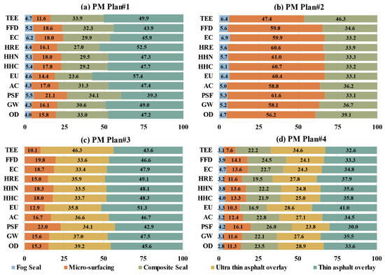 After the LCEI of each PM technique was evaluated, the LCEI of PM planning for the entire life cycle of asphalt pavement can be assessed. Generally, the reduction of pavement service life to less than 75% is the implementation period of PM, while the life of expressway asphalt pavement is 15 years in China. Zheng, et al. [63] stated that 60% of highways in China will undergo major and medium maintenance after 10–12 years. Therefore, the PM planning period for asphalt pavement is 12 years in this study, and four PM plans have been formulated, as shown in Figure 10. The design principles are as follows: