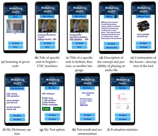 Mobile learning is becoming increasingly important for foreign language learning. Its key benefits are as follows: the enhancement of the learner’s cognitive capacity, the learner’s motivation to study in both formal and informal settings, the learner’s autonomy and confidence, and the promotion of personalized learning, helping low-achieving students to reach their study goals [40]. We have developed an application for mobile systems Mobil2Eng, which has the task of modernising the teaching process in English 1 in engineering studies. The application was created as a solution for mobile phones, using modern development environments. They allow the application to be easy to use, to be independent of the type of mobile device, and to achieve a range of functionalities that give students a more interactive, intuitive, and individualised approach to mastering the technical profession’s words and expressions. Students get related terms, pronunciation, descriptions in Serbian and English, in addition to the opportunity to test their knowledge and create their dictionaries and learning focuses.