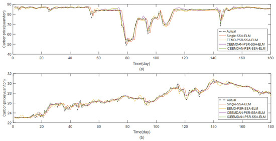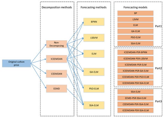 Figure 2. In part 1, the BP, LSSVM, ELM, GA-ELM, PSO-ELM, and SSA-ELM models were contrasted to verify the necessity of the optimization method and the superiority of optimizing ELM by SSA. In part 2, the ICEEMDAN-PSR-BP, ICEEMDAN-PSR-LSSVM, ICEEMDAN-PSR-GA-ELM, ICEEMDAN-PSR-PSO-ELM, and ICEEMDAN-PSR-SSA-ELM models were compared to verify the availability of the ICEEMDAN algorithm; meanwhile, the advantage of using the SSA-ELM model is further verified. In part 3, the SSA-ELM, EEMD-PSR-SSA-ELM, CEEMDAN-PSR-SSA-ELM, and ICEEMDAN-PSR-SSA-ELM models were contrasted to verify the advancement of ICEEMDAN and the essential importance of decomposing the carbon price.