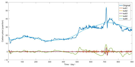 29]. Therefore, to better predict carbon prices, the original sequence of carbon prices needs to be further decomposed. Empirical mode decomposition (EMD) is a familiar decomposing method that has attracted the attention of researchers. Using the EMD to pre-process carbon price series can better analyze the internal characteristics of the series. Compared with a single non-decomposing model, the hybrid EMD can more effectively improve the prediction accuracy [