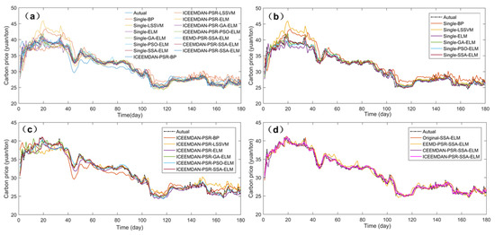 Figure 10a. For analyzing the results more concisely, (b), (c), and (d) show the prediction results of single forecast models, the same decomposition method with different prediction models, and the different decomposition methods with the same forecast model, respectively.