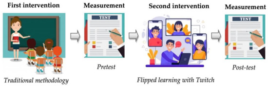 The field work was structured at different times (Figure 1). First, the training process was carried out using a traditional methodology (first intervention). The teacher became the only source of knowledge transmission. The students played a passive role. They only limited themselves to receiving explanations from the teacher and carrying out the proposed activities. Next, the first measurement (pretest) took place, in order to collect information on this first training action. Next, the teacher applied a new methodology. This time, it was based on an innovative approach through the Twitch app (second intervention). With this tool, the teacher developed the contents in a virtual environment that allowed interaction with the students. In this case, the students assumed a greater role, being able to interact both with each other and with the teacher. In addition, another potentiality was that the sessions were registered on the platform for later consultation by the students. At the end of this novel approach, the second measurement (post-test) took place.