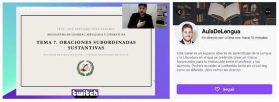 In order to carry out the implementation of the methodology with Twitch (Figure 2) and the use of this digital platform by the students, several legal aspects were taken into account. In the first place, the approval of the management team of the educational center was requested, and the necessary documentation was delivered to duly inform them of the procedure of the investigation methodology. Subsequently, legal authorization was requested from the parents of the students for the use of Twitch, and an attached report was sent that explained the investigation procedure. Twitch declares in its “Terms of Service” and “Use of Twitch by minors and blocked persons” website that this digital platform cannot be used by persons under 13 years of age. All students who participated in this research are over that age and have received authorization from their parents or guardians. The reception of the research by the teaching staff of the center, the students, and the parents and tutors were in general very satisfactory.